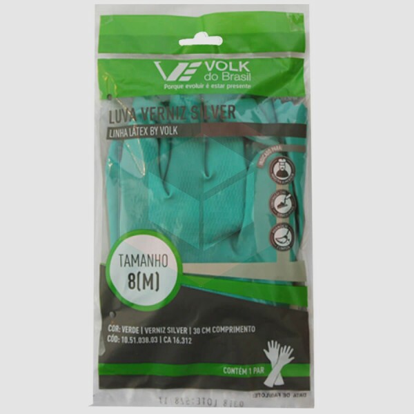 As luvas de látex natural com verniz Silver da Volk são consideradas equipamentos para proteção individual (EPI), para proteção das mãos confeccionadas em borracha natural, que é o látex, na cor verde, revestida internamente com verniz silver, que proporciona menor probabilidade a alergias, superfície externa antiderrapante na palma e face palmar dos dedos, lisa na face dorsal e punho. Espessura de 0,42mm e comprimento de 30cm (aproximadamente).